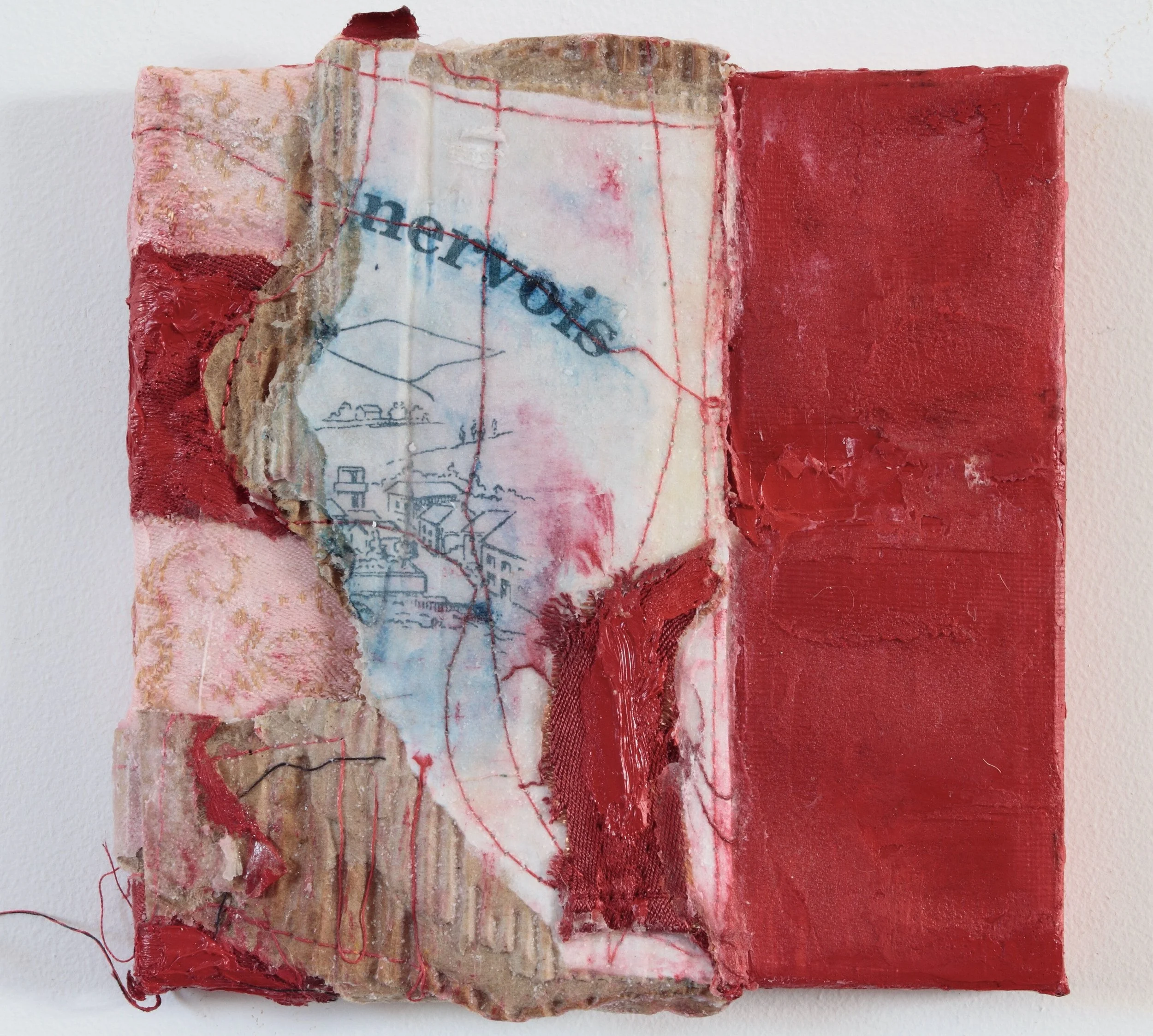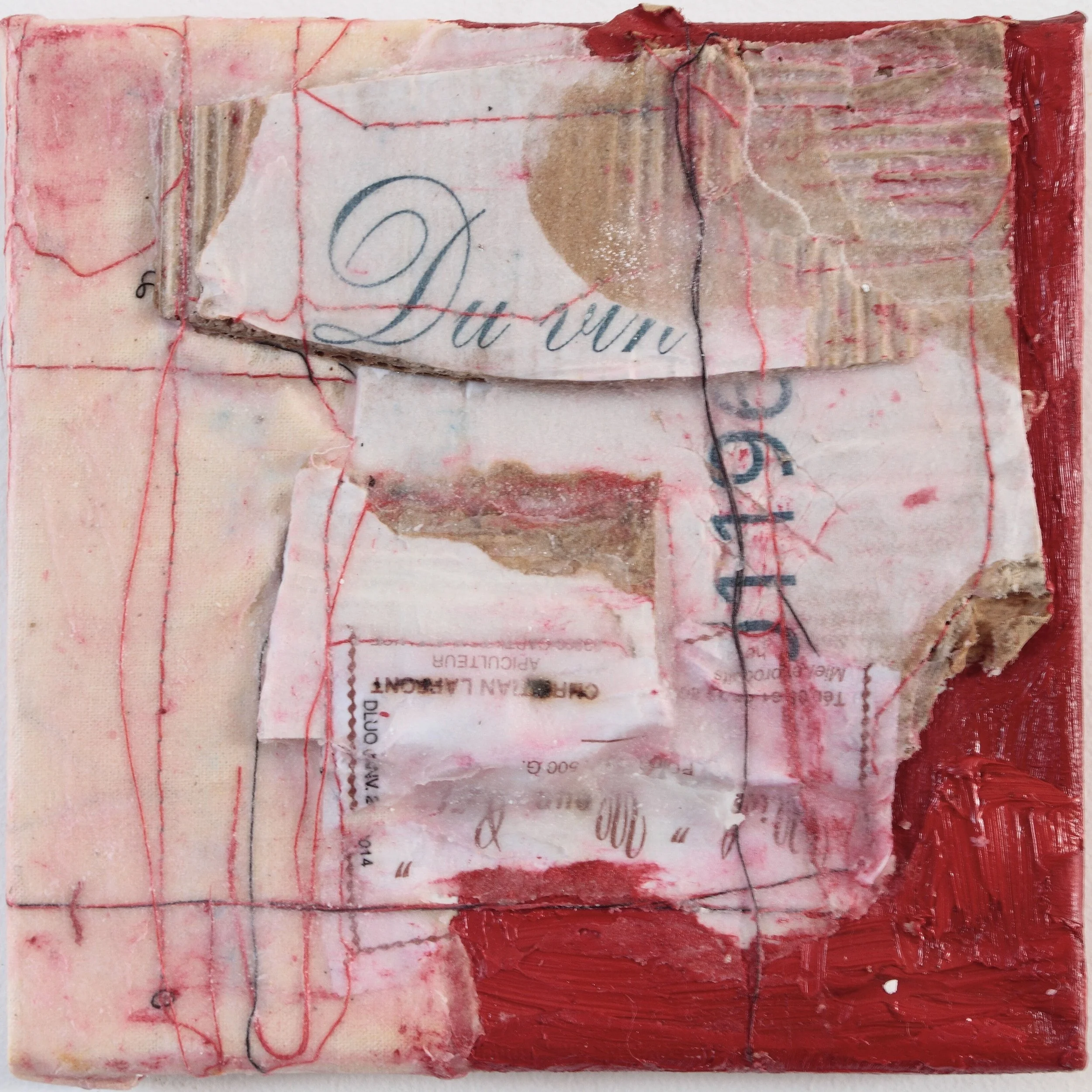 I created small works which for me resonate visual diaries about travel, boarders, globalisation movement, connections, limitations language and culture. These intimate small abstracted compositions are authentic and include collected objects during my travels in France such as tickets, coins dockets/ receipts, plane tickets.