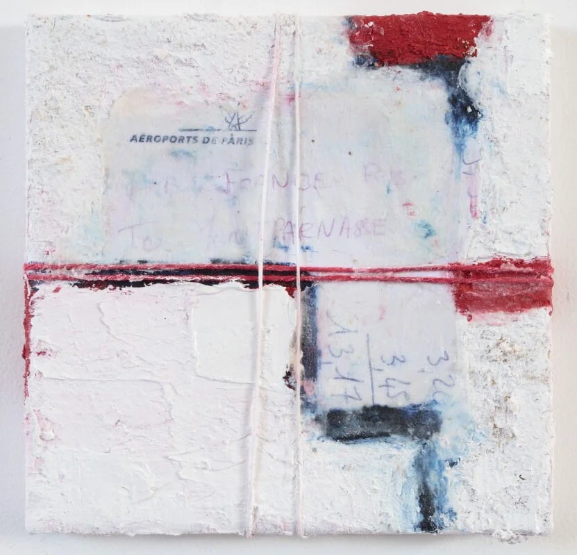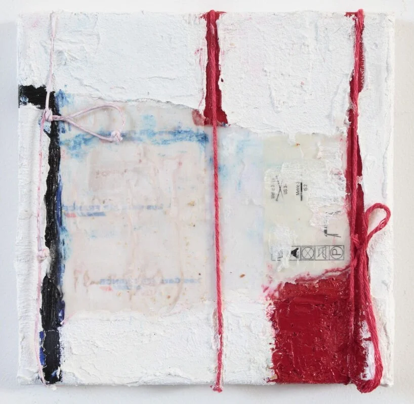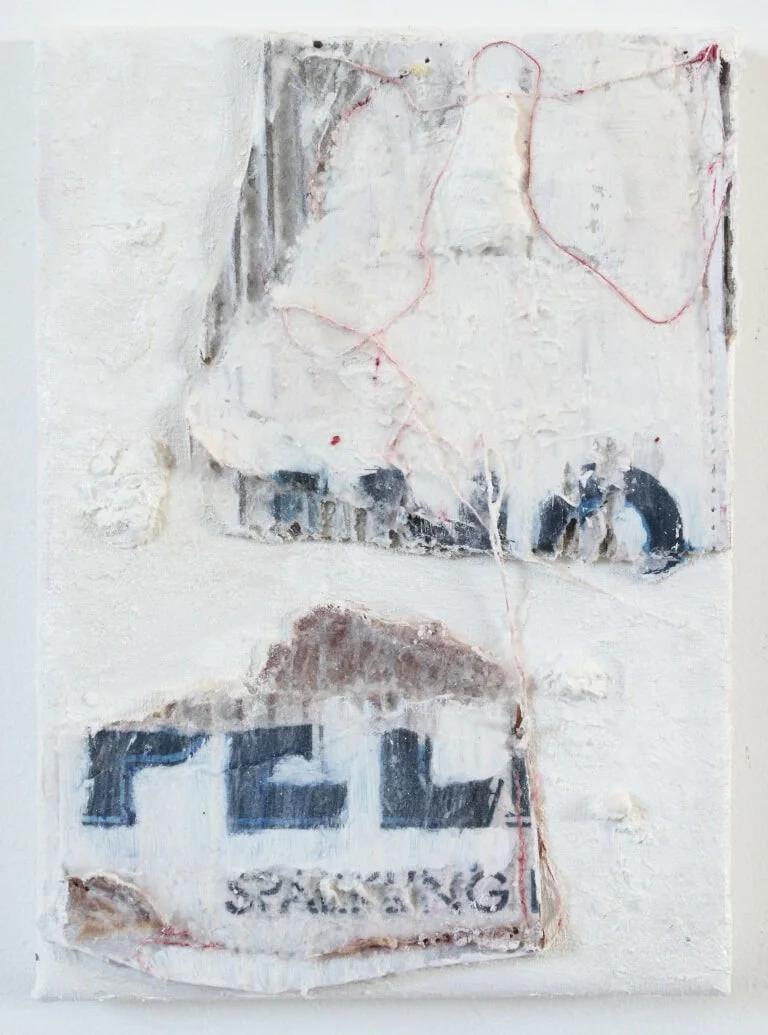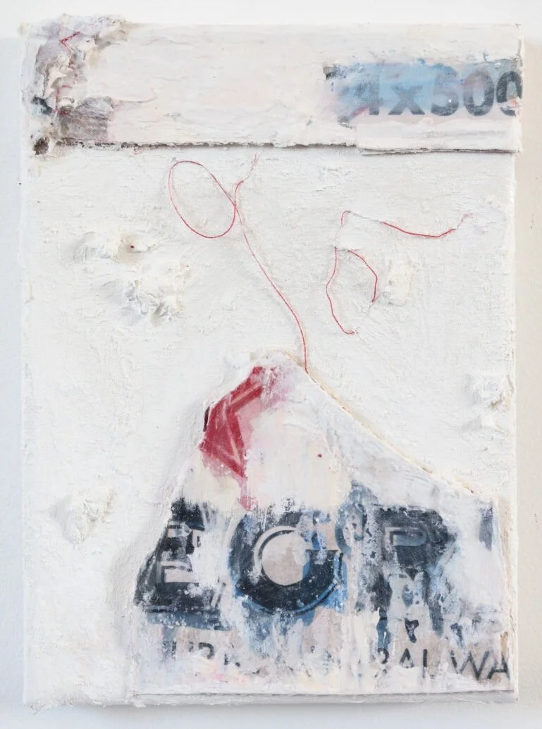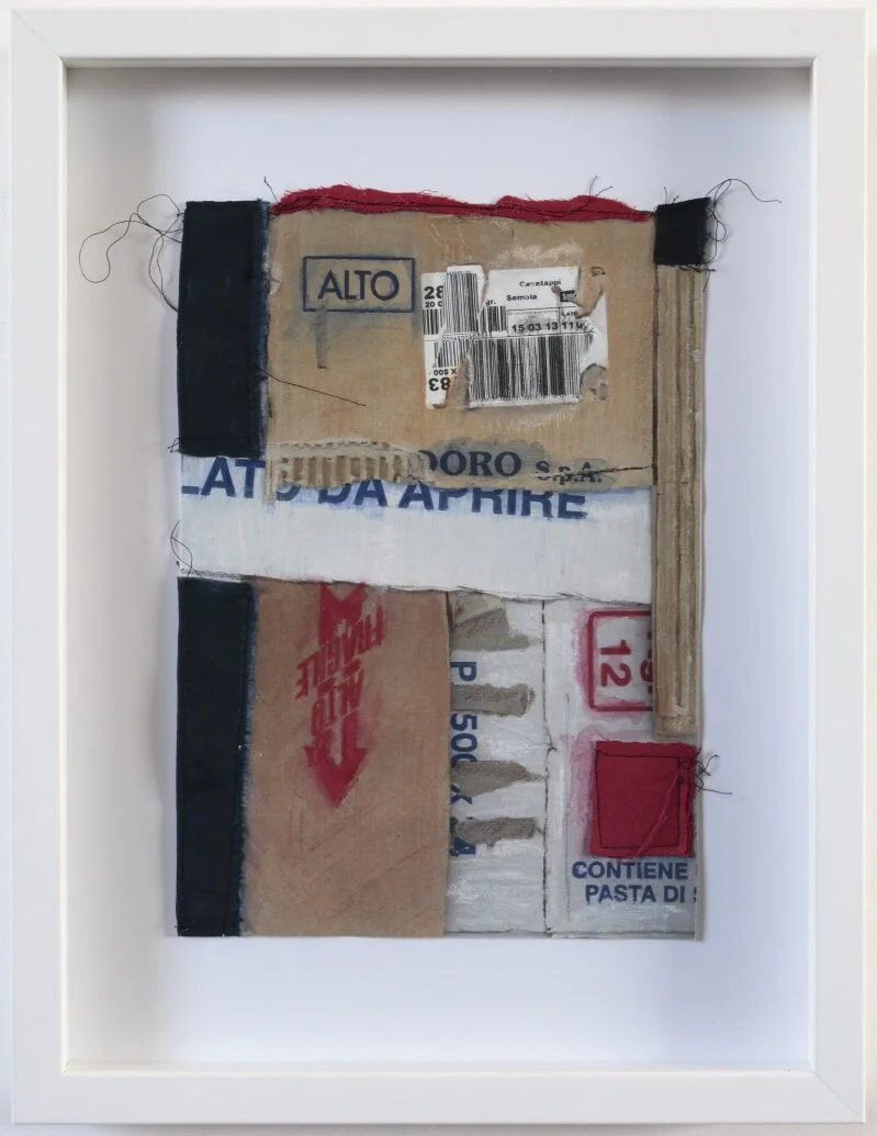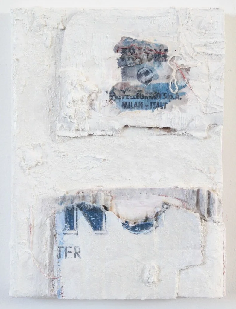 Layering and stitching together pigments, swathes of material, torn card and typography, Caione resurrects into artworks those short-lived, material remnants of other times and places. Text is cut and abstracted. Broken barcodes and stamps, no longer read. Colours sing in chalky white silence and meaning sense is loosened.