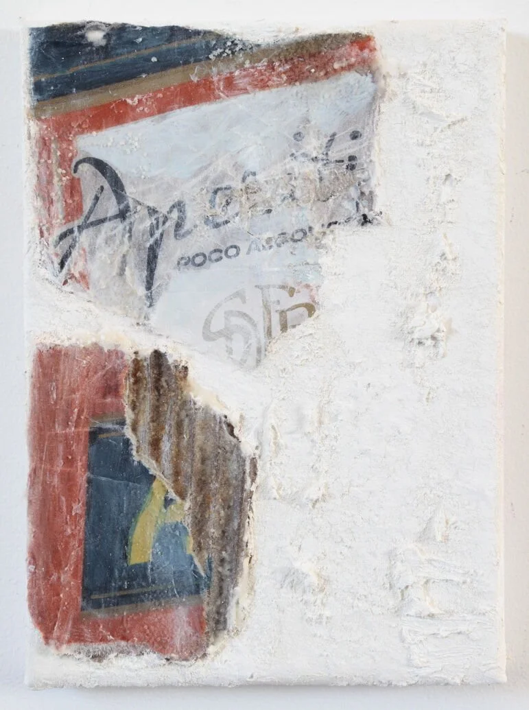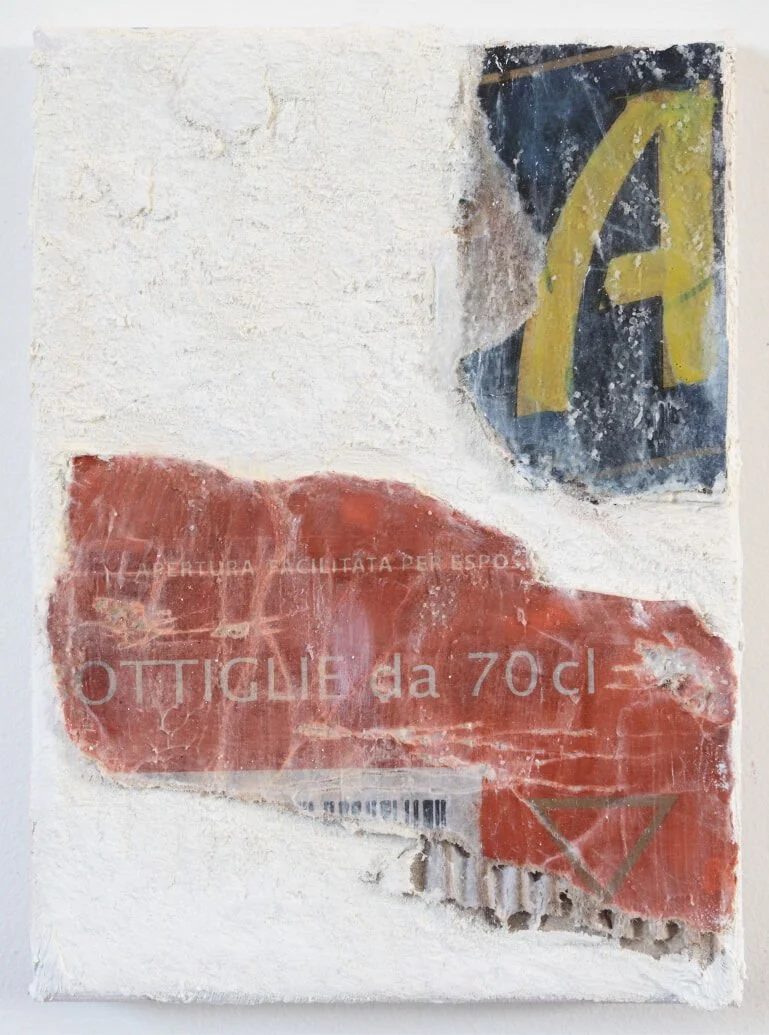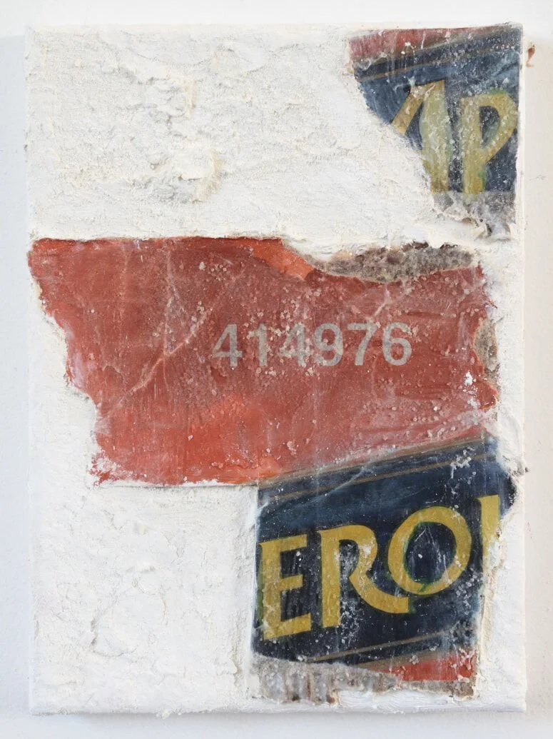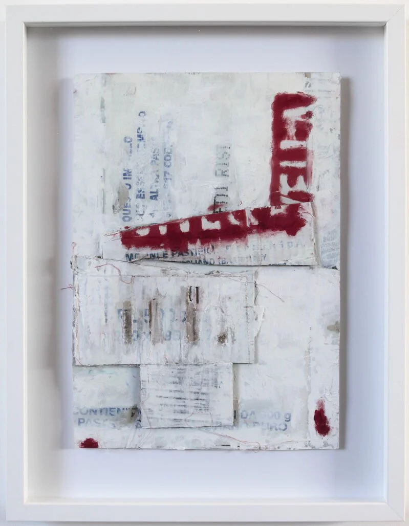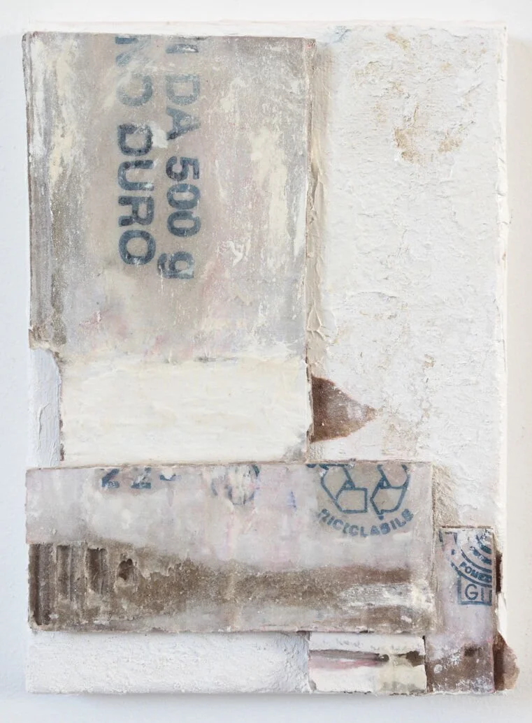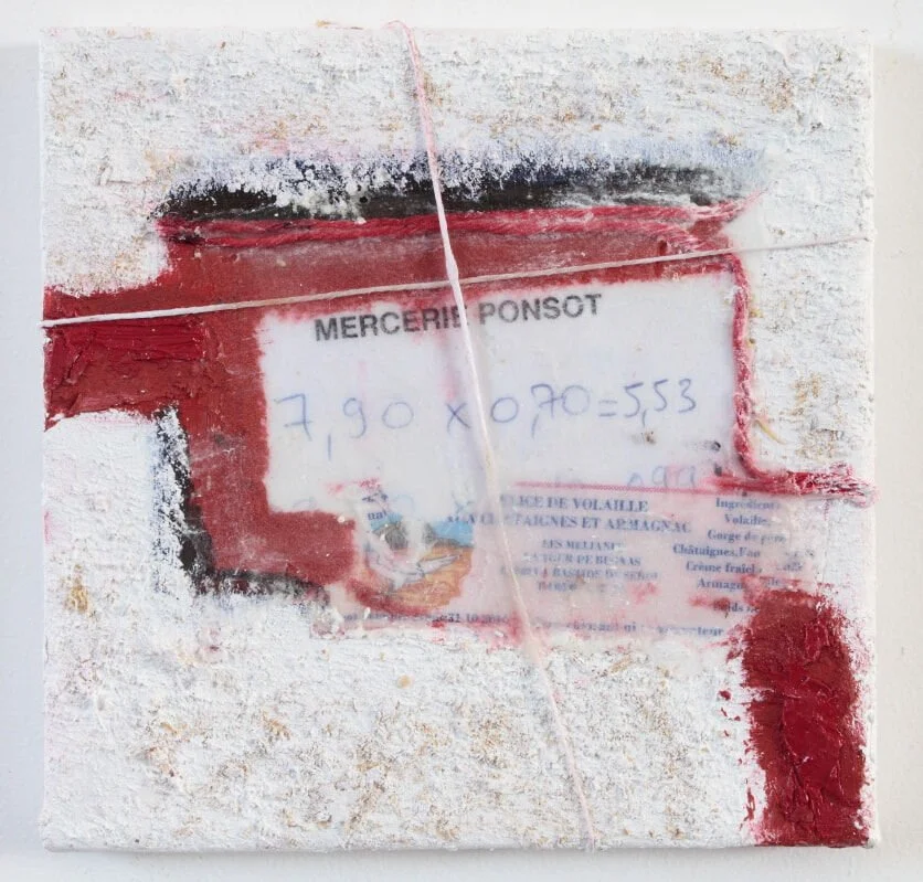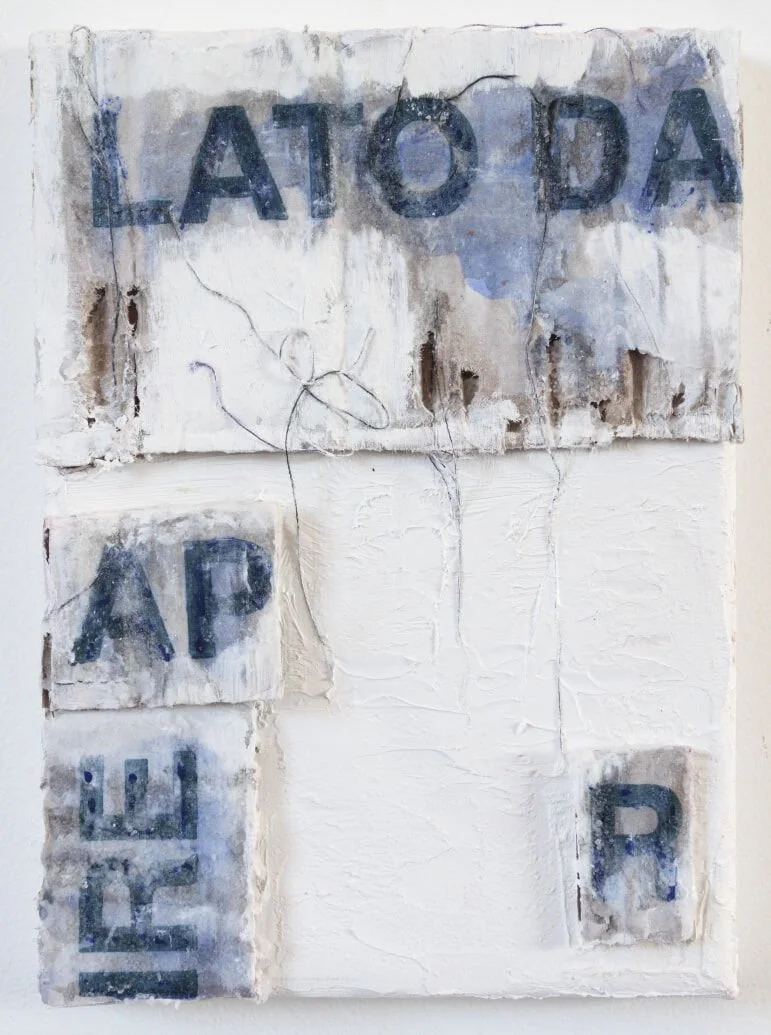 Layering and stitching together pigments, swathes of material, torn card and typography, Caione resurrects into artworks those short-lived, material remnants of other times and places. Text is cut and abstracted. Broken barcodes and stamps, no longer read. Colours sing in chalky white silence and meaning sense is loosened.