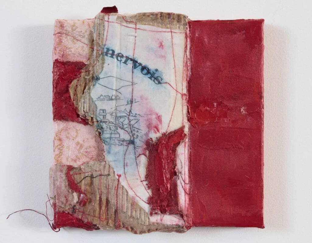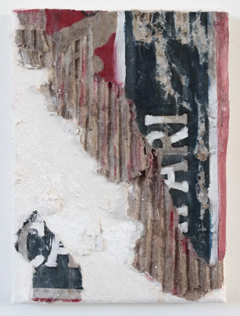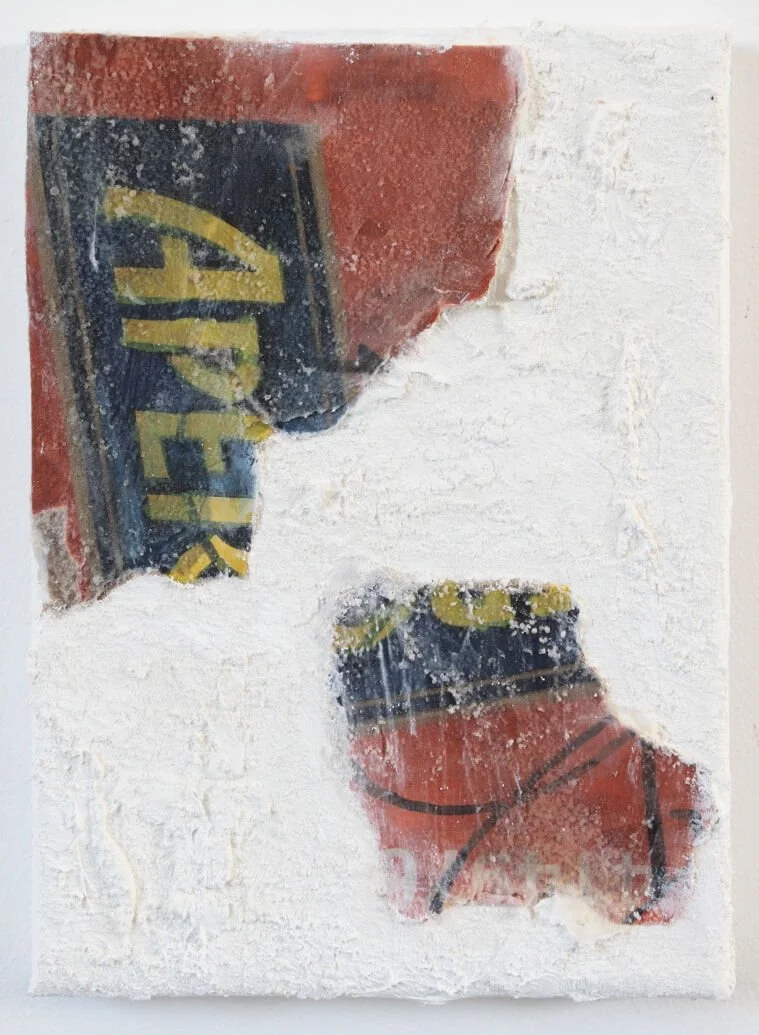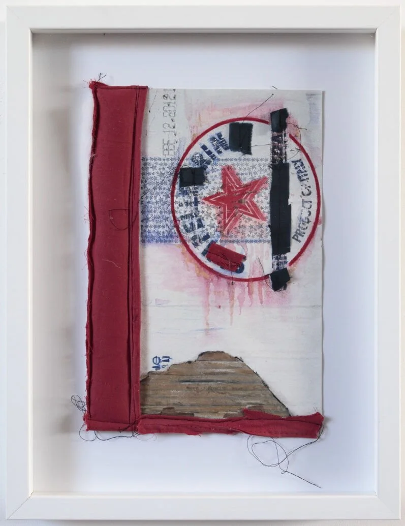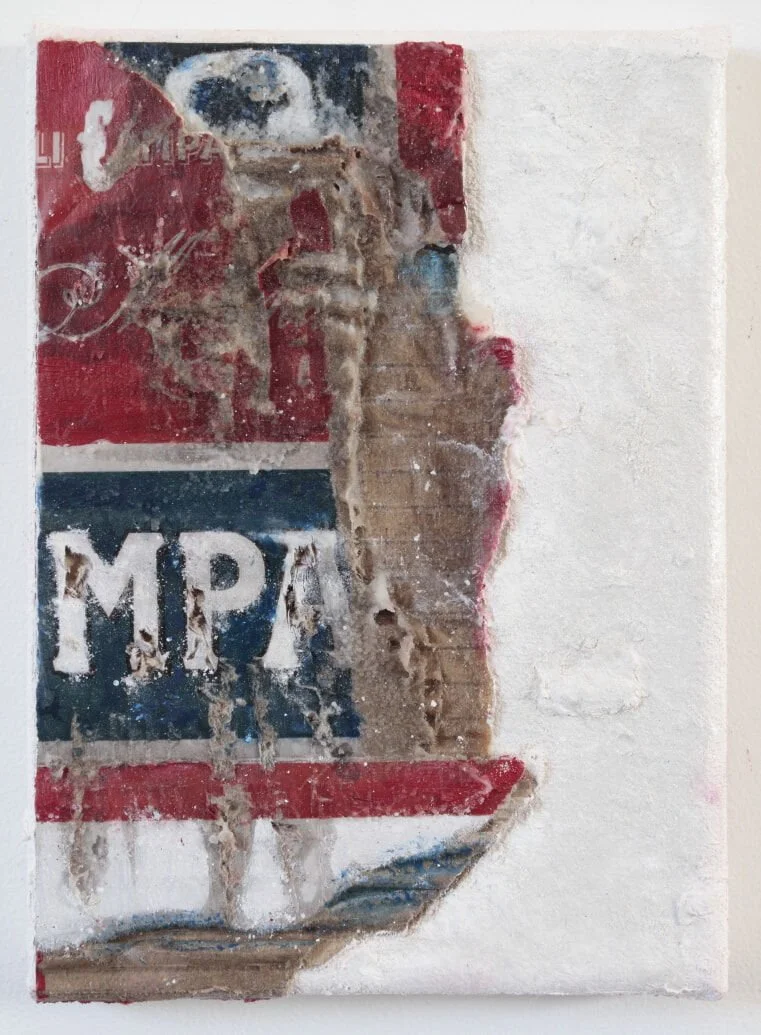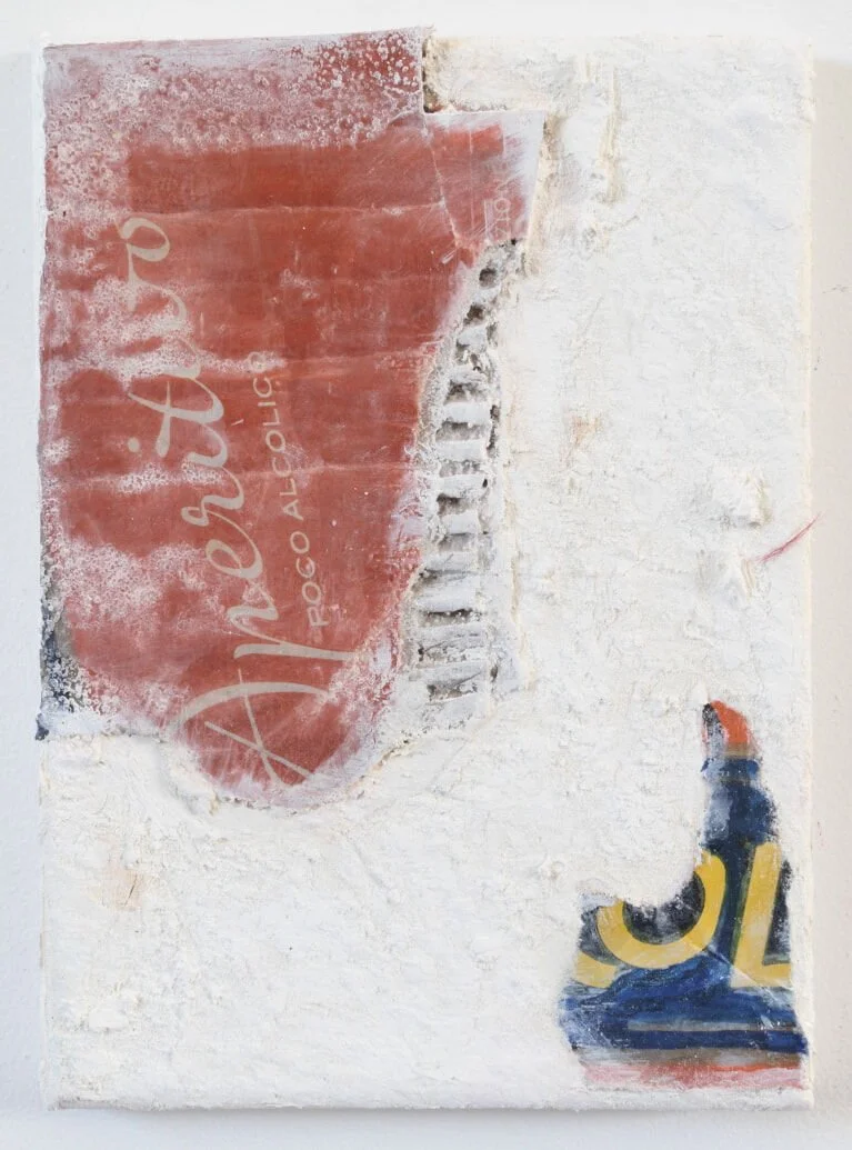 Layering and stitching together pigments, swathes of material, torn card and typography, Caione resurrects into artworks those short-lived, material remnants of other times and places. Text is cut and abstracted. Broken barcodes and stamps, no longer read. Colours sing in chalky white silence and meaning sense is loosened.
