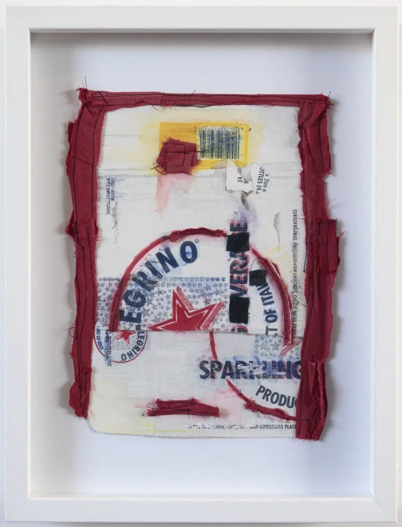 Caione engages this poetics of remembrance; reworking traditional, aristocratic textiles; used card-boxes; iconic graphics and raw pigments all sourced from Italy. These „fabrics‟ are holders and carriers that have undergone gradual and imperceptible change. In her choice of signature modernist Italian graphics like Fortunato Depero‟s designs for Campari and San Pellegrino – brands which are now widely recognized in many countries of the world – Caione considers the politics of globalization, taste and consumption.